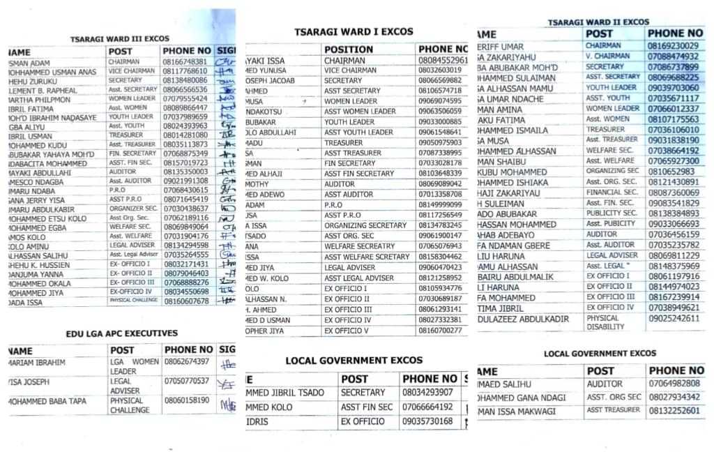 The statement was jointly signed by 81 ward and local government APC executives in Tsaragi District Wards 1, 2 and 3 of Edu Local Government Area, who reiterated their rejection of what they termed the illegal suspension of Hon. Yisa Saba Gideon.