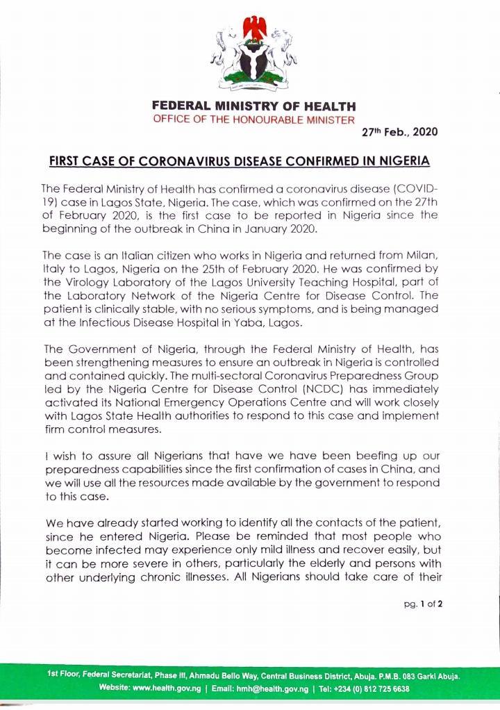 Minister of Health, Osagie Ehanrie, confirmed this in a press statement obtained by The Informant247, he disclosed that “The case is an Italian citizen who works in Nigeria and returned from Milan, Italy to Lagos, Nigeria on the 25th of February 2020.”