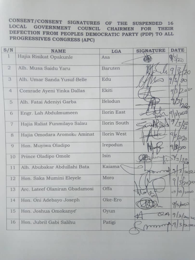 In a statement jointly signed by the ALGON chairman, Joshua O. Omokanye and secretary, Abubakar Abdullahi Bata and obtained by THE INFORMANT247 in Ilorin, the Kwara state capital, they insisted that though he was not present at APC campaign in Patigi but he consented to a document which he personally accepted and signed along with others to defect to APC on March 9, 2020.