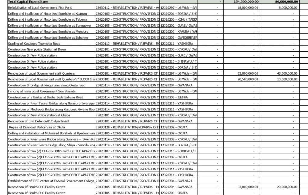 The breakdown shows that N48,000,000 was spent on the renovation of Local Government staff quarters. An additional N10,000,000 went into the renovation of “C” Block 9 and 10 of the same quarters.