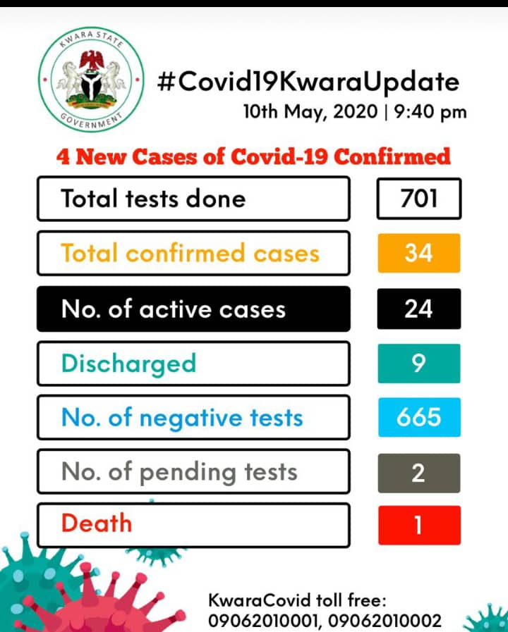 In the new figures released, the total number of coronavirus active cases in Kwara is 24, with 9 discharge and 1 death.