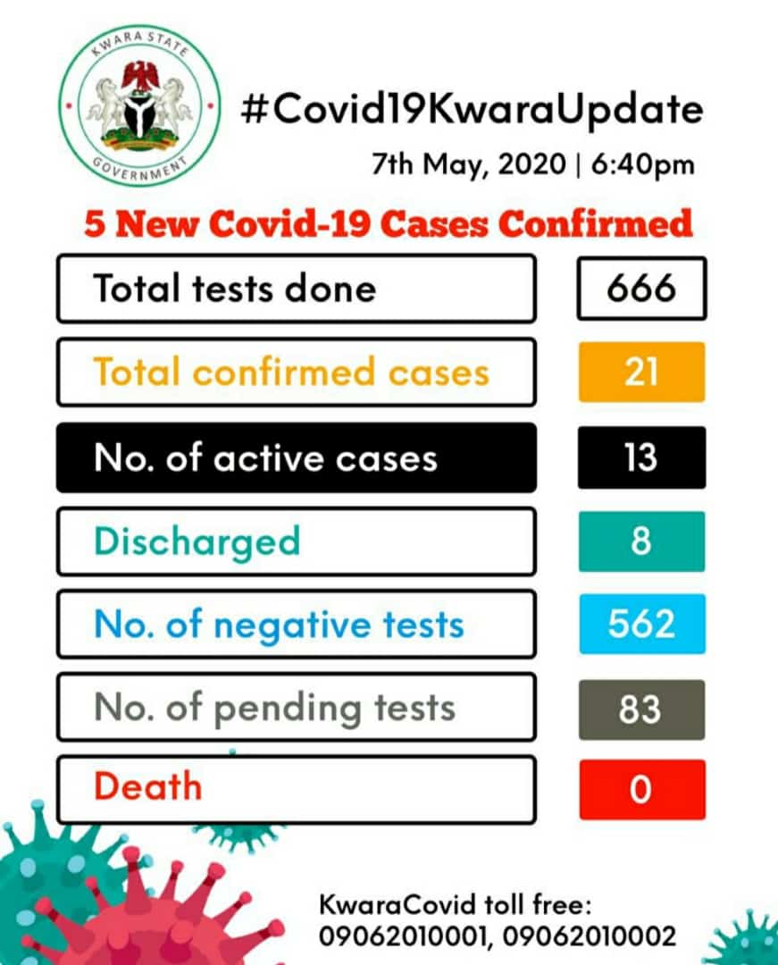 Kwara State has recorded 5 new coronavirus cases, bringing the number of infections in the state to 21.