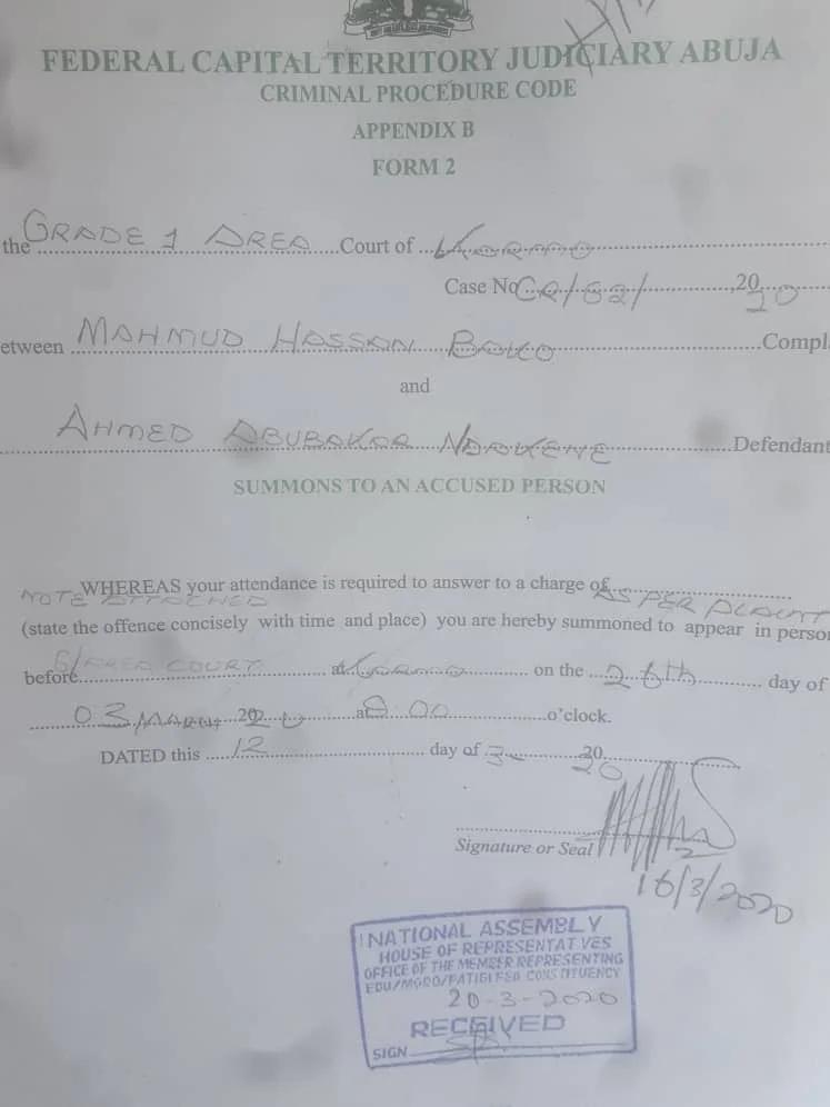 Justice M. Inuwa of Karmo Grade 1 Area Court, Abuja, has threatened to issue arrest warrant against a serving federal lawmaker representing Edu/Moro/Patigi constituency, Ahmed Abubakar Ndakene, for his absence in a certificate forgery suit against him.