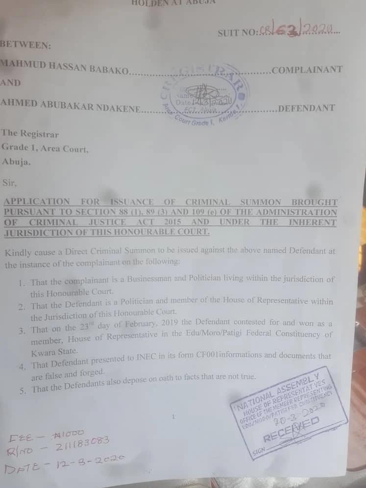 The complainant, a candidate of the Peoples Democratic Party in the election that saw Ndakene emerge winner, Mahmud Hassan Babako, alleged that the assertion by the lawmaker that he has a B.Sc in Economics from Ahmadu Bello University, Zaria is false and added that he must have forged the documents.
