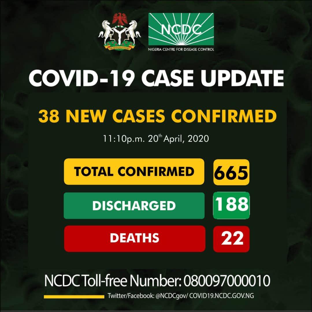 The Nigeria Centre for Disease Control (NCDC) on Monday confirmed that 38 new COVID-19 cases were recorded in eight states. These are Kano, Kaduna, Federal Capital Territory (Abuja), Gombe, Abi, Sokoto, Ekiti and Borno states as Nigeria’s tally rose to 665.