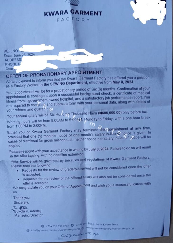 Some workers at the Kwara Garment Factory have accused the management of subjecting them to poor welfare conditions, non-increment of salary, and harsh policies that they claim make them feel like “secondary school students.”