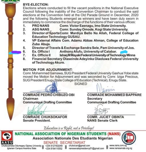 Meanwhile, the communiqué of NANS, National Secretariat issued at the end of its 65th Senate Sitting held at the Alex Ekweme Federal University, Ndufu Alike, Ebonyi State between the 18th and 19th of March 2021 also revealed that Adebayo is not the Ex. Officio 1 as claimed.