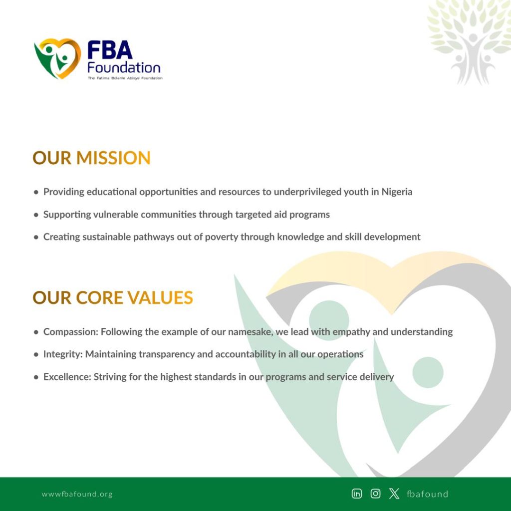 The Foundation’s vision is to create a Nigeria where every youth has access to quality education and a fair opportunity to reach their full potential. Its mission includes providing educational opportunities, supporting vulnerable communities, and building sustainable pathways out of poverty through knowledge and skill development.