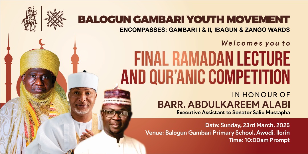 The Gambari community is set to host the 2025 Ramadan Lecture and Qur’anic Competition in honour of Barr. Alabi Abdulkareem, the Executive Assistant to Senator Saliu Mustapha, the Turaki of Ilorin Emirate.