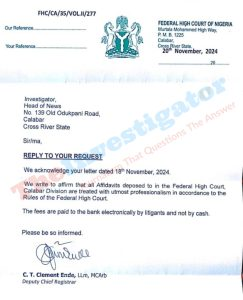 “We write to affirm that all Affidavits deposed to in the Federal High Court, Calabar Division are treated with utmost professionalism in accordance to the Rules of the Federal High Court,” Clement stated, adding that “The fees are paid to the bank electronically by litigants and not by cash.”