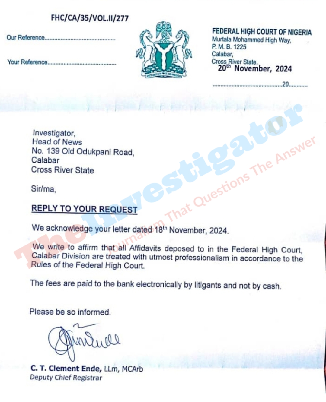 The Deputy Chief Registrar, Federal High Court Calabar, C.T. Clement Ende replied to the FOI request, asserting that they act professionally.