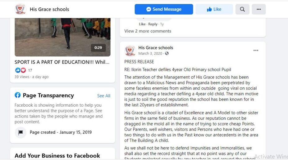 New facts have emerged on how a popular academy in Kwara State, His Grace Schools owned by Mr. and Mrs. Adekanye, attempted to cover-up the case of a Yoruba teacher in the school who sexually molested a seven-year-old primary pupil.