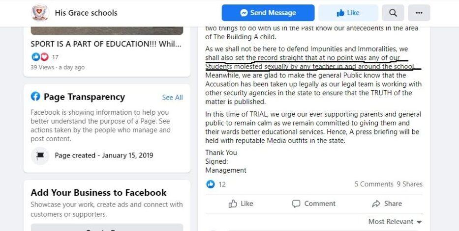 Releasing the statement on its website and social media pages on March 4, 2020, the school described the sexual molestation case as “malicious and propaganda been perpetrated by some faceless enemies from within and outside” adding that the motive of the report was to “soil” the school’s reputation.