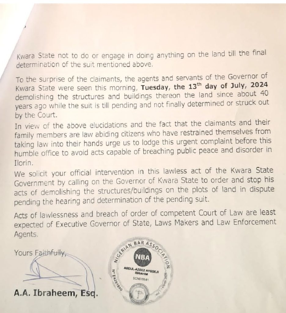 Lawyers representing Asa Investment Limited and the Saraki family have petitioned the Kwara State Commissioner of Police, CP Olaiya Victor Mobolaji, to urge Kwara Governor Abdulrahman Abdulrazaq, to respect the court order restraining them from taking any action on disputed Ile-Arugbo plots of land.