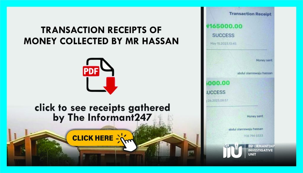 Verified transaction receipts, exclusively obtained and studied over a period of two months by The Informant247, showed that Mr. Hassan received funds at different times from students through the two class representatives, with the amounts deposited into either of his two personal accounts in multiple tranches.