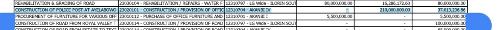 Official financial records reviewed by The Informant247 show that under the item titled “Construction of Police Post at Ayelabowo” (23020101 – Construction/Provision of Office, 12310704 – Akanbi IV), the council recorded a full-year actual expenditure of N210,000,000 in 2025.
