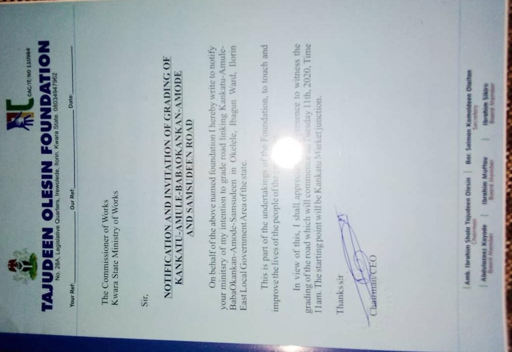 The foundation’s spokesperson, Mansur Kolawole told THE INFORMANT247 correspondent that a letter was forwarded to the Kwara State Ministry of Works on August 5 seeking the government’s approval for the grading of the road link for the conveniency of the commuters.