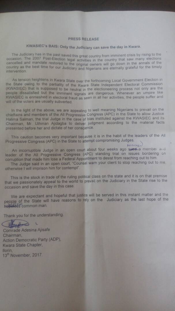 Meanwhile, the Chairman of the Action Democratic Party (ADP) in Kwara State, Comrade Adesina Ajisafe in a statement released today said the trial judge should be allowed to deliver “the judgement based on material facts placed before her and the dictate of her conscience”.