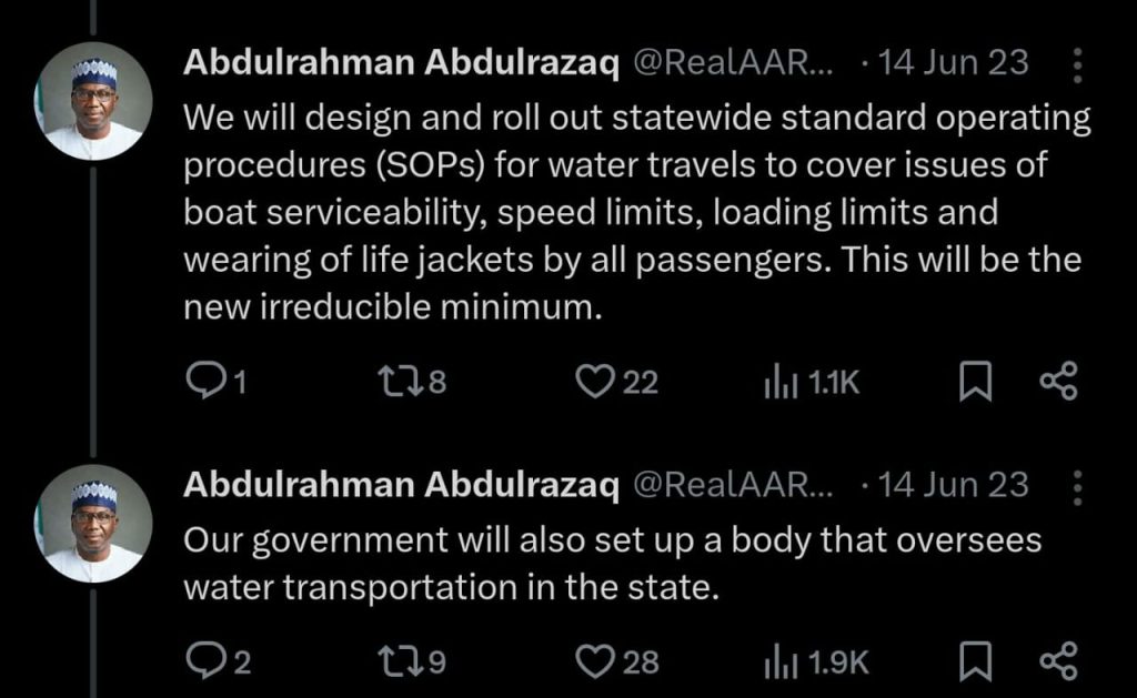 There was hope when Governor Abdulrazaq, after last year’s disaster, promised to establish a body to oversee water travel in the state. This, experts said, would improve safety, reduce overloading and prevent the non-use of life jackets, which are the leading causes of accidents.