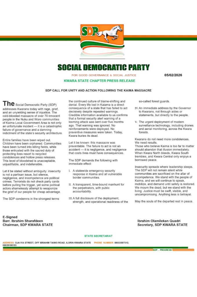 The Social Democratic Party (SDP) has condemned the killing of more than 70 residents in the Nuku and Woro communities of Kaima Local Government Area of Kwara State, describing the incident as a grave failure of governance and security.