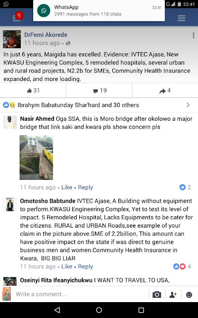 “IVTEC Ajase-ipo, A building without equipment to perform. KWASU complex, yet to test it’s level of impact. 5 Remodeled hospital, lacks Equipment to be cater for the citizen (sic.) …” Replied a Facebook user.