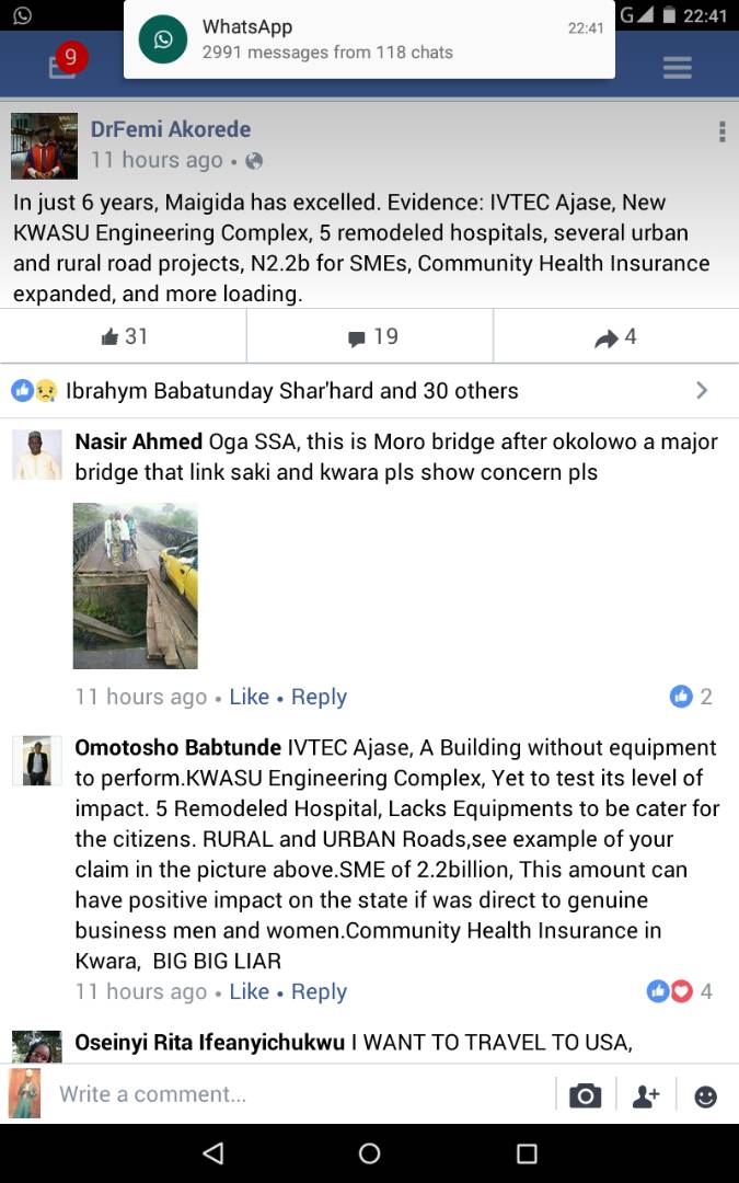 “IVTEC Ajase-ipo, A building without equipment to perform. KWASU complex, yet to test it’s level of impact. 5 Remodeled hospital, lacks Equipment to be cater for the citizen (sic.) …” Replied a Facebook user.
