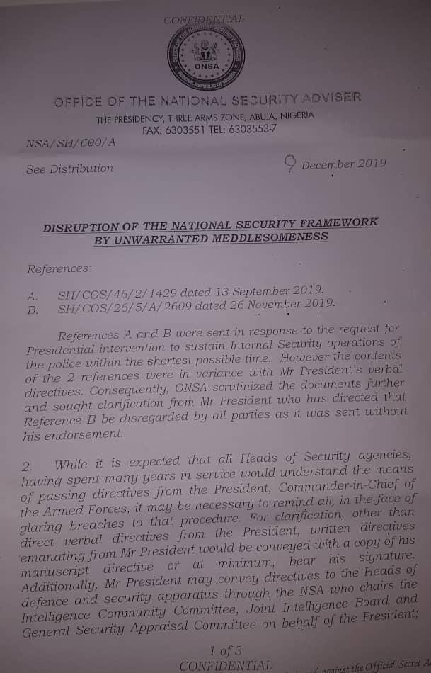 In a letter dated December 9, 2019, tittled ‘Disruption of the national security framework by unwarranted meddlesomeness’ addressed to the service chiefs which was published by Premium Times on Monday, the NSA said the chief of staff was neither a security official nor head of any government agency.