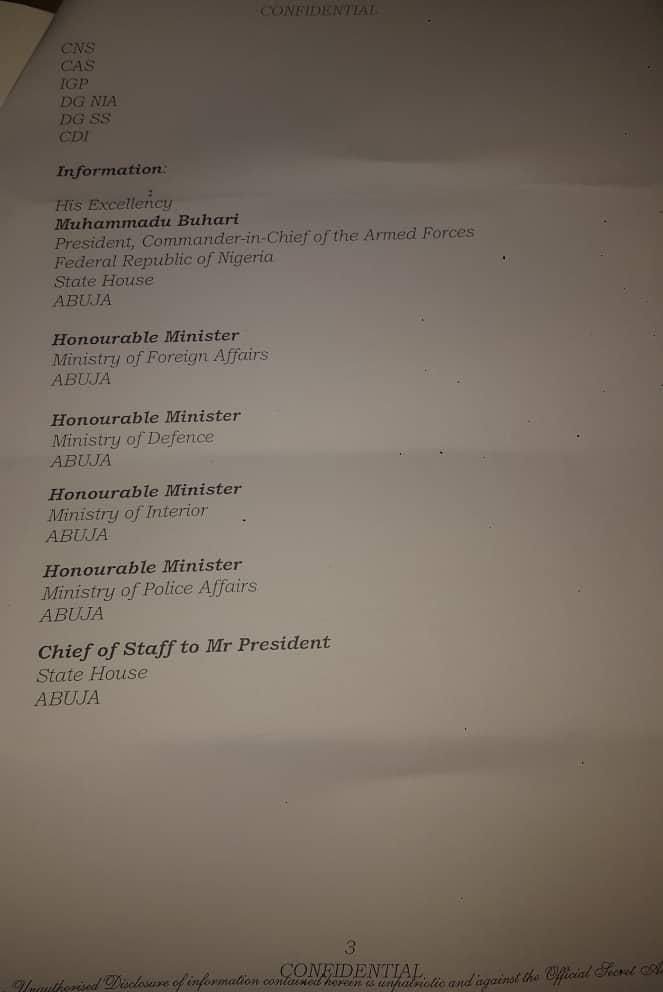 The letter read in part, “While it is expected that all heads of security agencies, having spent many years in service would understand means of passing directives from the President, Commander-in-Chief of the Armed Forces, it may be necessary to remind all, in the face of glaring breaches to that procedure.