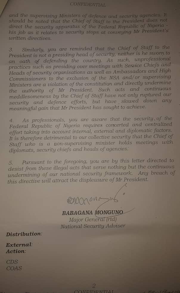 In a letter dated December 9, 2019, tittled ‘Disruption of the national security framework by unwarranted meddlesomeness’ addressed to the service chiefs which was published by Premium Times on Monday, the NSA said the chief of staff was neither a security official nor head of any government agency.