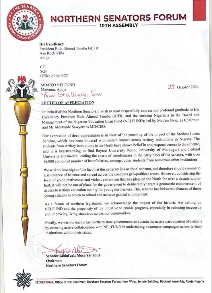 The letter reads, “On behalf of the Northern Senators, I wish to most respectfully express our profound gratitude to His Excellency President Bola Ahmed Tinubu GCFR, and the eminent Nigerians in the Board and Management of the Nigerian Education Loan Fund (NELFUND); led by Mr Jim Ovia, as Chairman and Mr Akintunde Sawyerr as MD/CEO.