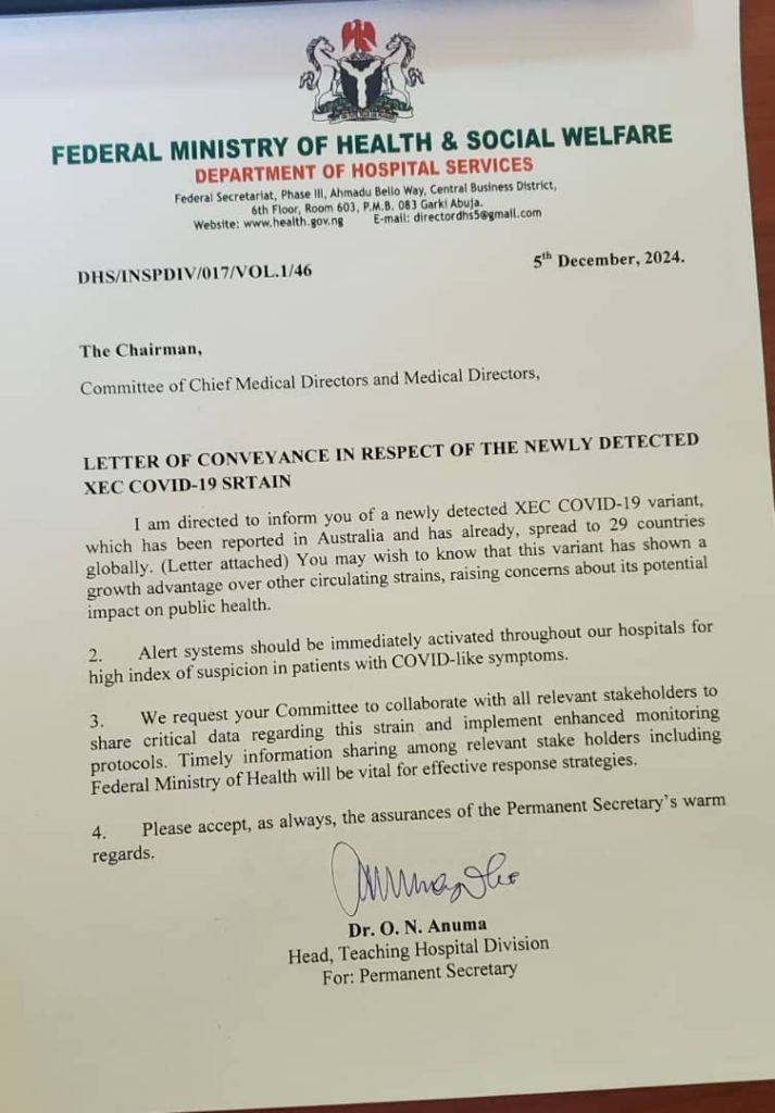 According to a circular with reference number DHS/INSPDIV/017/VOL.1/46 and dated 5th December 2024, which was obtained by The Informant247, the Head of Teaching Hospital Division for Permanent Secretary, Dr. O. N. Anuma alerted that the new variant has shown a growth advantage over other circulating strains, raising concerns about its potential impact on public health.