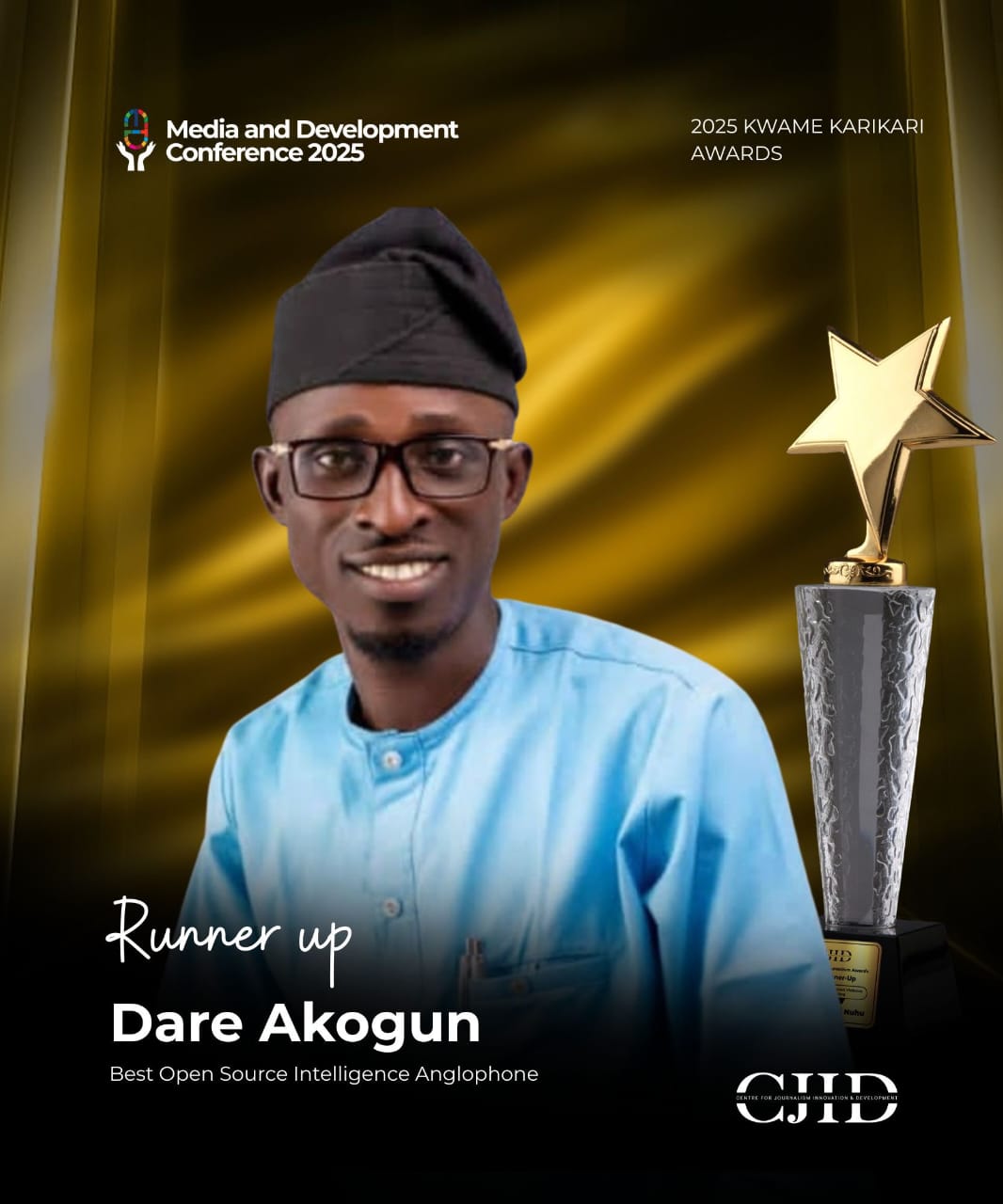 Nigerian-based Award-winning journalist Dare Akogun, affectionately known as DaRadioGeneral, has received the runner-up award in the Best Open Source Intelligence (OSINT), Anglophone category at the 2025 Kwame Karikari Awards, held on Friday in Abuja.