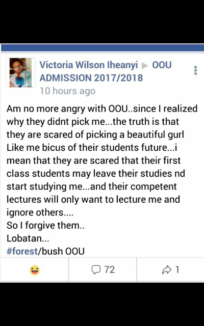 “Am no more angry with OOU..since I realized why they didnt pick me…the truth is that they are scared of picking a beautiful gurl Like me bicus of their students future…i mean that they are scared that their first class students may leave their studies nd start studying me…and their competent lectures will only want to lecture me and ignore others….