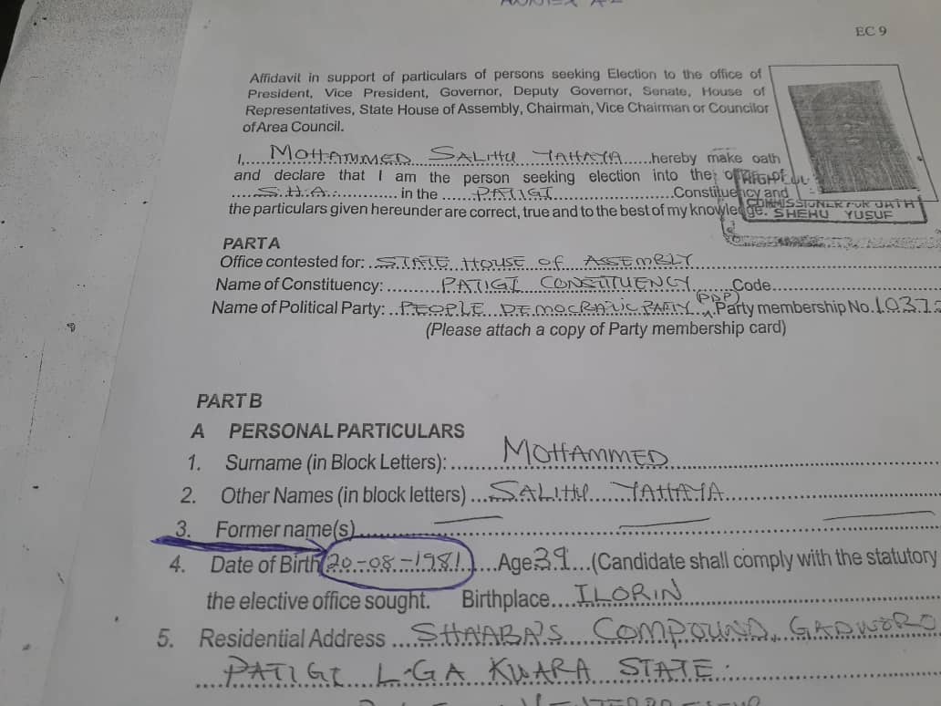 The legal adviser of the group, Mr. Mohammed Mohammed said Yahaya while filling (INEC) Form EC9 “gave his date of birth as 20th August 1981, (Annex A2) as against 20th August 1979 (Annex B), the same information the candidate gave INEC as shown on his Permanent Voter’s Card (PVC), a deliberate false information”.