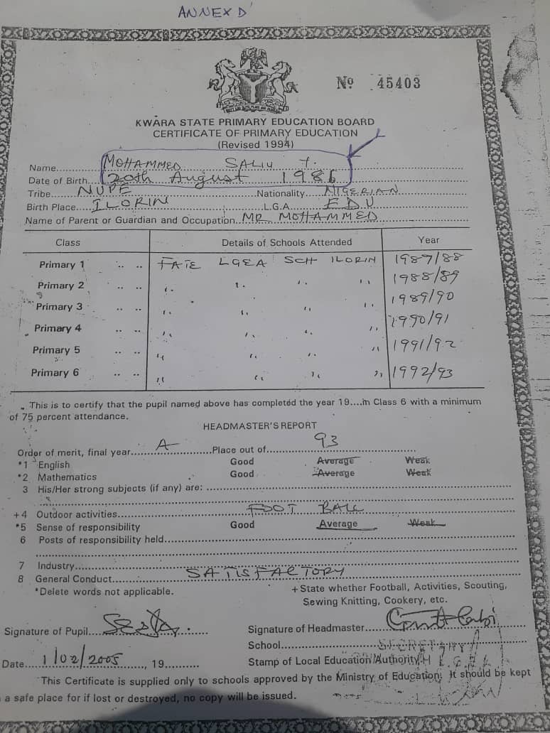 According to Mohammed, The candidate went further to altered his year of birth on his primary school leaving certificate (Annex D).
