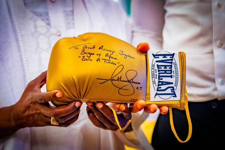 Inscription on the autographed glove which has the signature of Joshua reads “To Great Asiwaju Jagaban Borgu of Africa, Bola A. Tinubu”