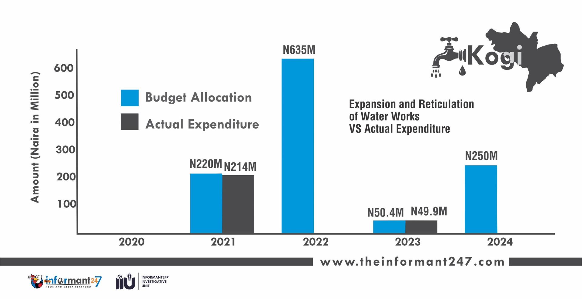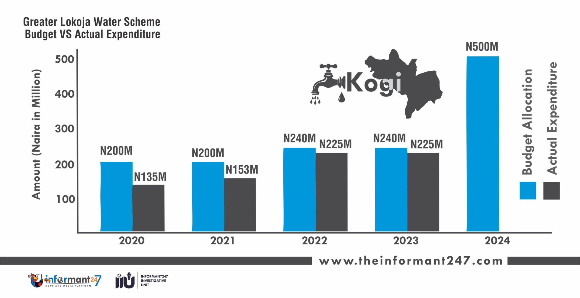 In its 2020 revised budget, the Kogi State government allocated ₦200 million to the Greater Lokoja Water Supply Scheme, but the actual expenditure was ₦135 million.