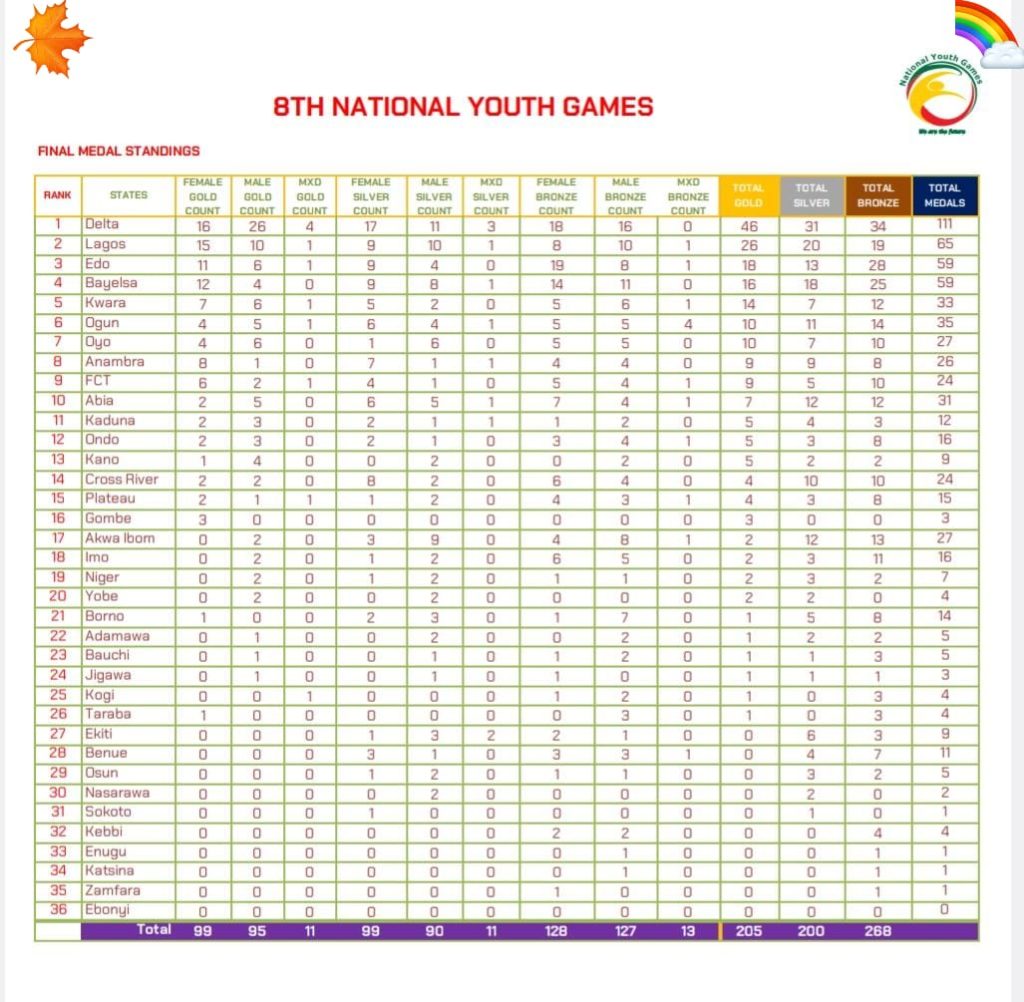 Delta state,host of the 8th edition of the National Youth Games has retained the title having emerged top of the medal table with 48 gold, 31 silver and 34 bronze, and a