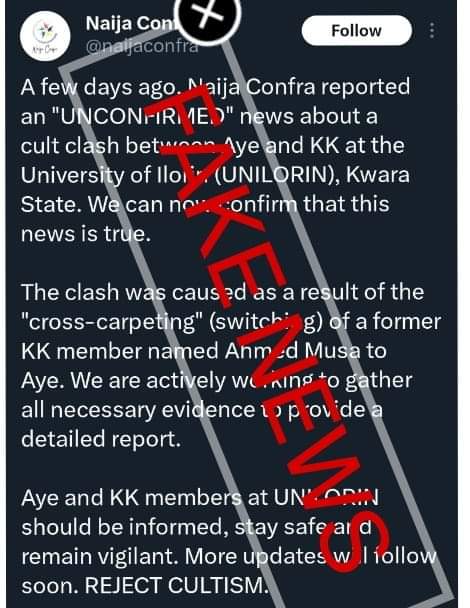 The management of the University of Ilorin has debunked a post on X (formerly Twitter) by one Naija Confra(@naijaconfra) on a purported cult clash at the institution.