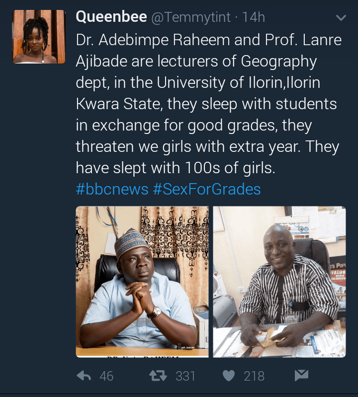 “Dr. Adebimpe Raheem and Prof. Lanre Ajibade are lecturers of Geography dept (sic), in the University of Ilorin, Ilorin Kwara State, they sleep with students in exchange for good grades, they threaten we, girls with extra year. They have slept with 100s of girls,”