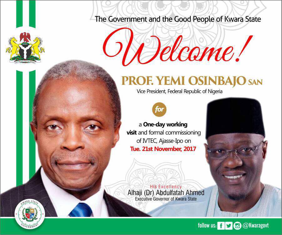 The Secretary to the State Government SSG, Alhaji Isiaka Gold, who disclosed this in Ilorin on Monday, said Osinbajo will commission the International Vocational, Training and Entrepreneurship College (IVTEC), Ajase-Ipo in Irepodun Local Government Area of the State during the visit.