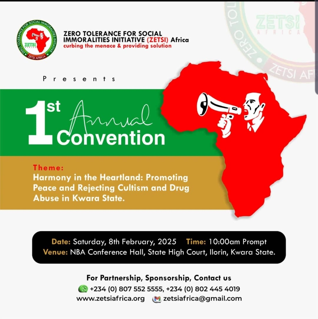 The Zero Tolerance for Social Immoralities Initiative (ZETSI) Africa, has announced its first annual Convention with the aim to bring together stakeholders, thought leaders, and members of the public to address the pressing issues of cultism and drug abuse in Kwara State.